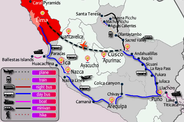 • Double decker bus "tour ticket" from Lima - Paracas - Ica- Nazca- Arequipa - Chivay - Puno - Cusco
