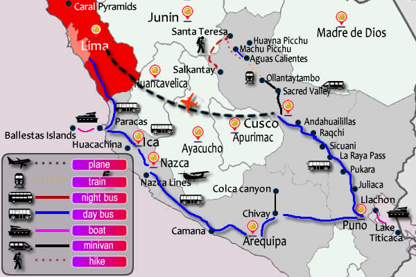 - Double decker bus "tour ticket" from Lima - Paracas - Ica- Nazca- Arequipa - Chivay - Puno - Cusco