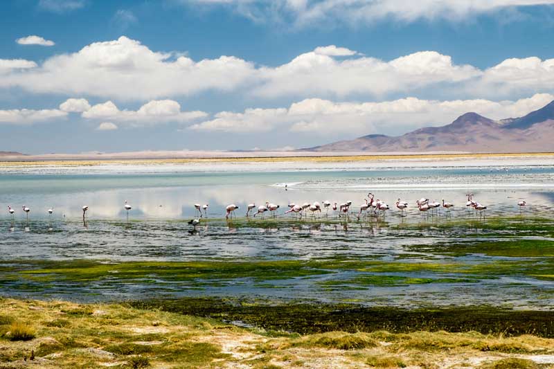 Atulcha - Lagunas - Laguna Colorada - Geysers - Hot Springs - Polques : We awake early and have breakfast before leaving to travel further south. You will first have the chance to visit the Sora Canyon and see llamas in their natural environment before continuing through the Chuguana desert area where the scenery will include a number of extinct volcanoes plus the semiactive Ollague. As the journey continues we will pass by high altitude lagoons that are home to 3 species of flamingo before arriving intothe desert of Siloli and the “tree of rock”. We then move onto the “Laguna Colorada”, an amazing red colored lake full of flamingos. Here is where we enter the Eduardo Avaroa National Park. In late afternoon we then go to visit the “Sol de Mañana” geysers and see the bubbling mud pools and steam jets. We will then continue to Polques where we find the hostel where we will spend the night. After dinner, you can decide to relax in the warm water pools of the local hot springs while enjoying the breathtaking starry sky.