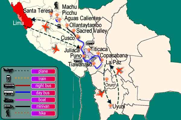 Lima, Homestay in Capacchica Llachón community, Lake Titicaca: Uros floating island & Taquile, Trip from Puno to La Paz Via Copacabana, Uyuni Salt flat excursion, Tiawanaku Monumental complex tour, Route of the sun from Puno to Cusco, guided visit of Cusco & nearby ruins, Sacred Valley tour, Santa Teresa thermal baths & Machu Picchu inca citadel.