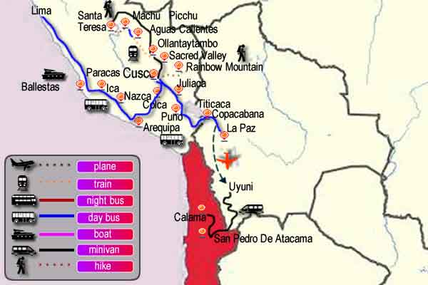 - Double decker bus "tour ticket" from Lima - Paracas - Ica - Nazca - Arequipa - Chivay - Cusco - Puno - Copacabana - La Paz - Uyuni